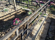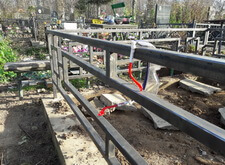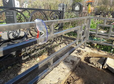 Возвращаемся на могилу. Подготавливаем оградку к покраске, зачищая её от старого покрытия. Параллельно устанавливаем подставку для памятника.